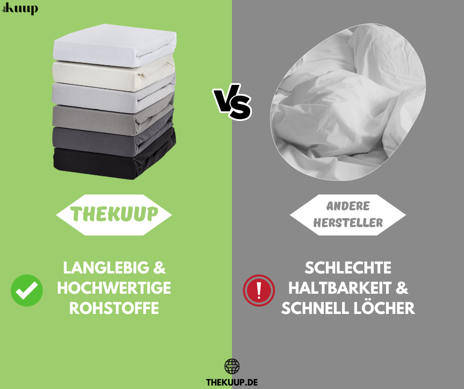 Wenn Sie strapazierfähige und komfortable Spannbettlaken suchen, sind Sie bei Thekuup richtig. Durch hochwertige Materialien und unsere spezielle Formel bieten unsere Spannbettlaken höchsten Komfort und eine lange Lebensdauer. Durch die umwelt- und hautfreundlichen Eigenschaften können Sie mit gutem Gewissen schlafen. Probieren Sie es aus und lassen Sie sich von der Qualität unserer Spannbettlaken überzeugen.