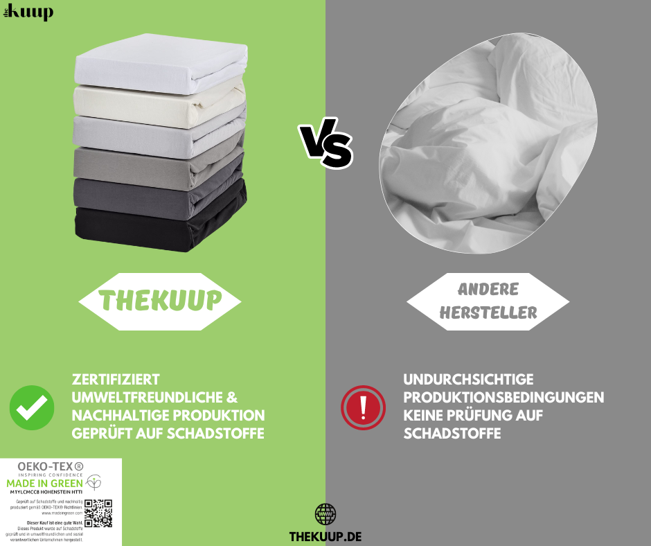 Bei Thekuup legen wir Wert auf umwelt- und hautfreundliche Materialien. Unsere Spannbettlaken sind daher MADE IN GREEN by OEKO-TEX zertifiziert. Diese Zertifizierung stellt sicher, dass Produkte auf Schadstoffe geprüft und an sicheren Arbeitsplätzen mit reduzierten Umweltbelastungen hergestellt werden. Somit können Sie sich darauf verlassen, dass Sie mit unseren Produkten eine gute Wahl für Ihr Zuhause treffen.